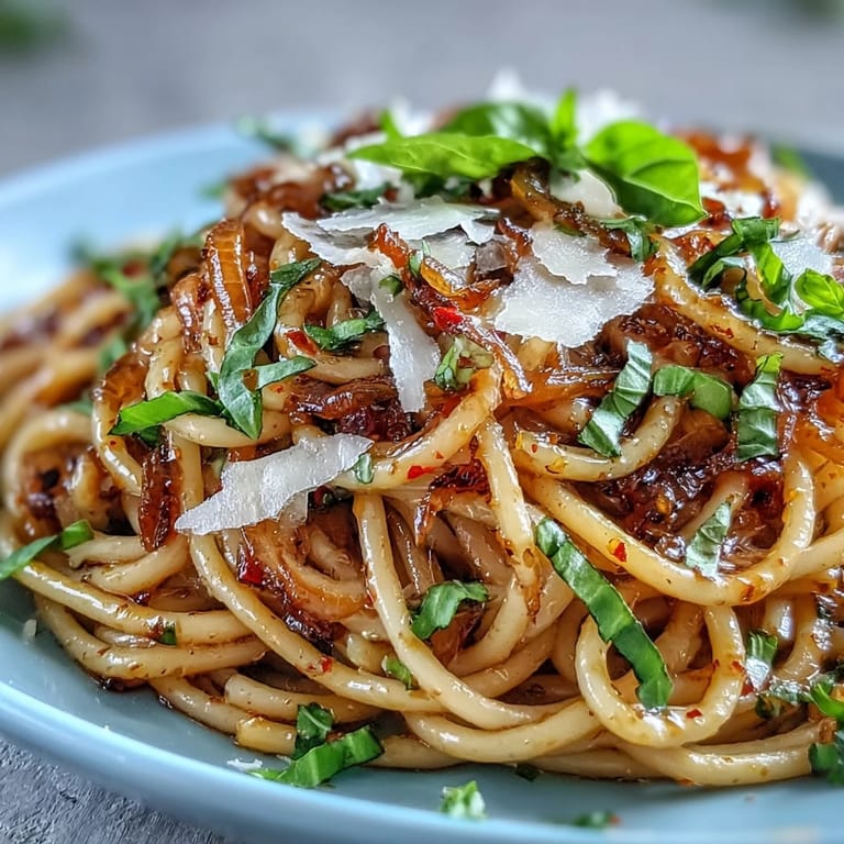 Save to Pinterest The first time I made caramelized onions, I stood over the stove for what felt like hours, convinced Id ruined them when they started turning brown. Now I know thats exactly where the magic happens. This pasta dish came together on a rainy Tuesday when I needed something cozy but didnt want to resort to the usual red sauce routine. The combination of sweet, slow-cooked onions and spicy homemade chili oil has since become my go-to when I want comfort food with a kick.