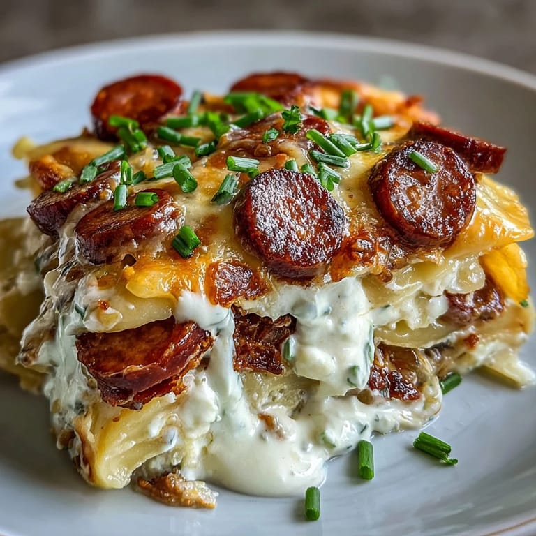 I've swapped the potato pierogi for sauerkraut ones when I wanted something tangier, and I've used turkey kielbasa when I needed a lighter version. You can toss in sautéed mushrooms or a handful of baby spinach between the layers for extra vegetables. If you like heat, a pinch of red pepper flakes in the sauce does wonders.