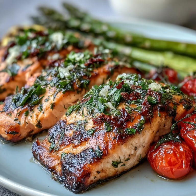 Save to Pinterest My neighbor knocked on the fence one summer evening with a bunch of asparagus from her garden, and I realized I had salmon thawing in the fridge. That's how this dish came together, really—not from a recipe book, but from what was on hand and the kind of cooking that happens when you stop overthinking it. The marinade came together in less time than it takes to heat the grill, and somehow the whole thing turned into something that tasted like we'd been planning it for days. There's something about lemon and fresh herbs that just makes salmon sing, and when you add those blistered cherry tomatoes, it becomes the kind of dinner that feels both simple and special.