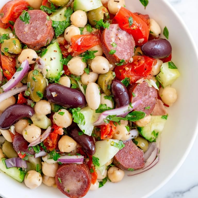 Save to Pinterest I threw this salad together on a Sunday afternoon when I had friends coming over and zero energy for anything complicated. The fridge had cans of beans, some salami from the deli, and a few sad vegetables that needed using. What started as a lazy cleanup meal turned into something everyone kept going back for. Now its my go-to when I want something filling that actually tastes like effort.