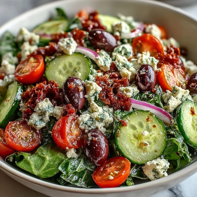 - Drizzle the dressing over the salad just before serving and toss gently so every leaf gets a light coating without becoming soggy. Top with crumbled feta and serve immediately while everything is still crisp and cold.