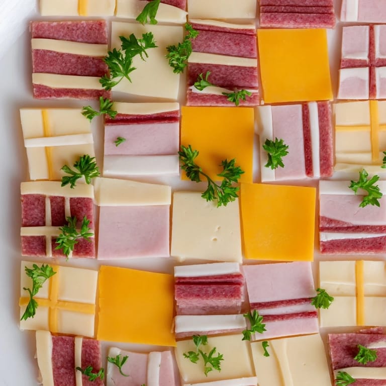 - Slice all your meats and cheeses into uniform two-inch squares, wiping your knife between cuts so the edges stay clean and sharp. This uniform sizing is what makes the patchwork feel intentional rather than haphazard.