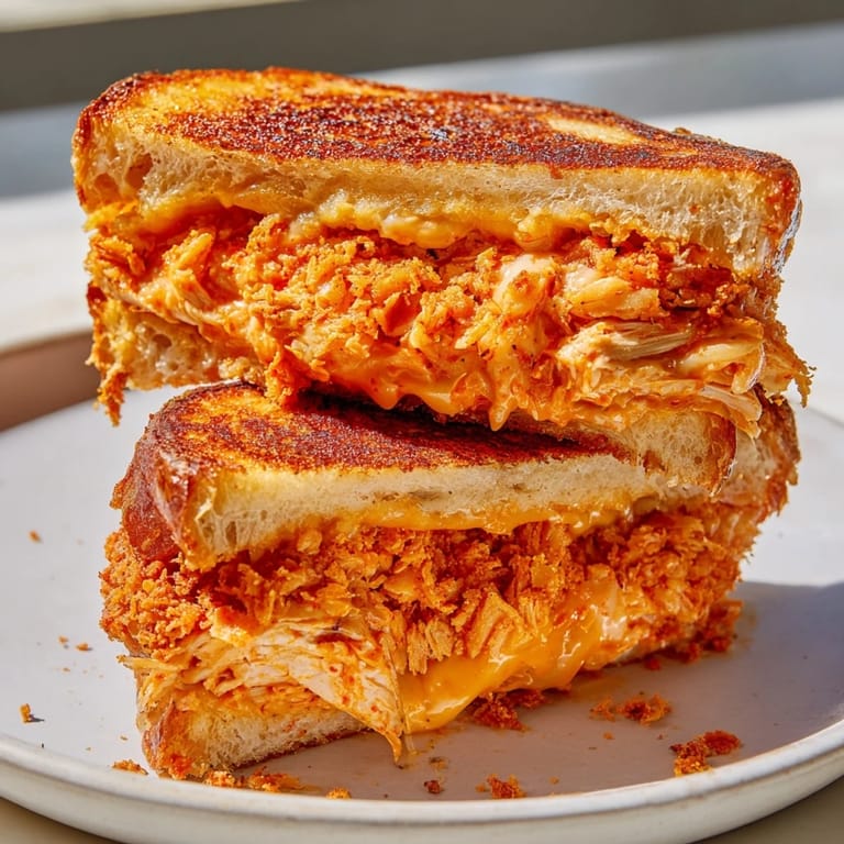 Save to Pinterest There's something about the sizzle of butter hitting a hot skillet that makes everything feel possible in the kitchen. One rainy afternoon, I was staring into my fridge at leftover rotisserie chicken, a block of sharp cheddar, and thick slices of sourdough, and suddenly it hit me—what if I took everything I loved about a crispy chicken sandwich and collided it with the nostalgic comfort of a grilled cheese? The result was this spicy, golden masterpiece that's somehow both indulgent and weirdly satisfying.