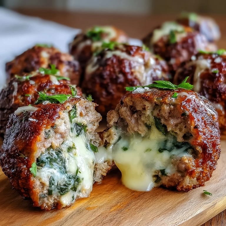 Save to Pinterest The first time I stuffed meatballs with cheese, my husband took one bite and his eyes went wide. That little molten surprise inside transforms an already comforting dish into something magical. I started adding spinach to make myself feel better about all that cheese, but honestly the vibrant green flecks make these meatballs beautiful too. Now they are the most requested dinner in our house.