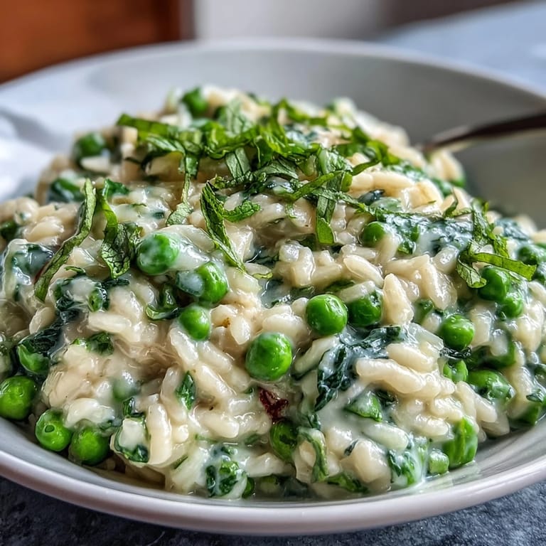 Save to Pinterest There's something about the first warm afternoon of spring that makes you crave something bright and creamy at the same time, and that's exactly when this risotto landed on my table. My neighbor stopped by with a basket of the earliest peas from her garden, still in their pods, and I spent an hour shelling them while she told me about her year. Those sweet little spheres inspired me to build an entire dish around them, layering in mint from my windowsill and enough butter and Parmesan to make it feel indulgent without weighing you down.